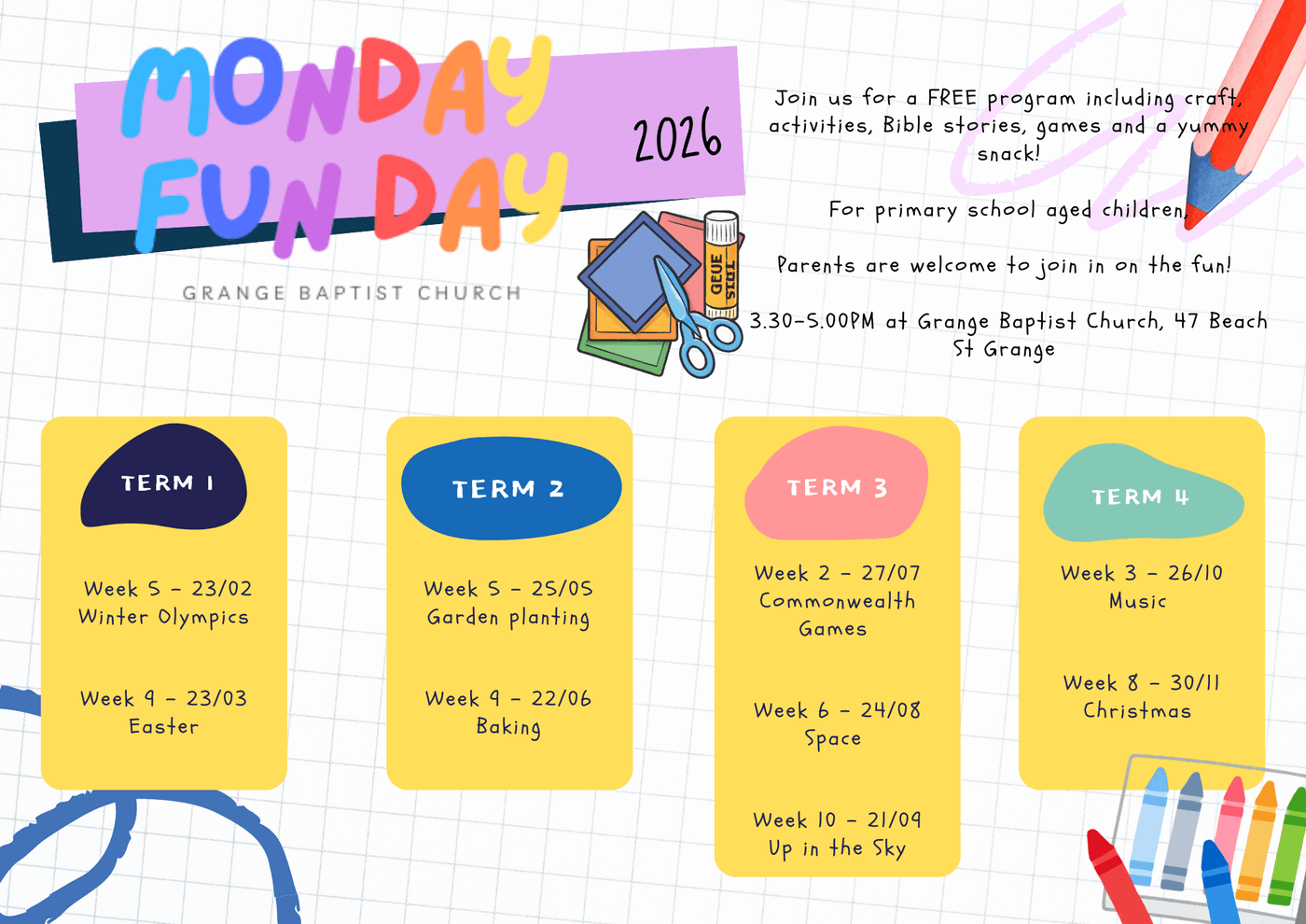 Bring your friends and come along to our next Monday Fun Day - Winter Olympics, Feb 23, always 3:30-5pm, and always includes after school snacks.